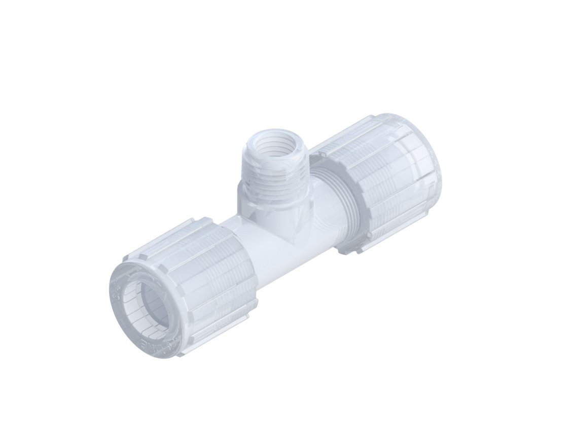 MALE BRANCH TEE, 3/4″ F X 1/2″ MNPT X 3/4″ F W/ PFA NUTS