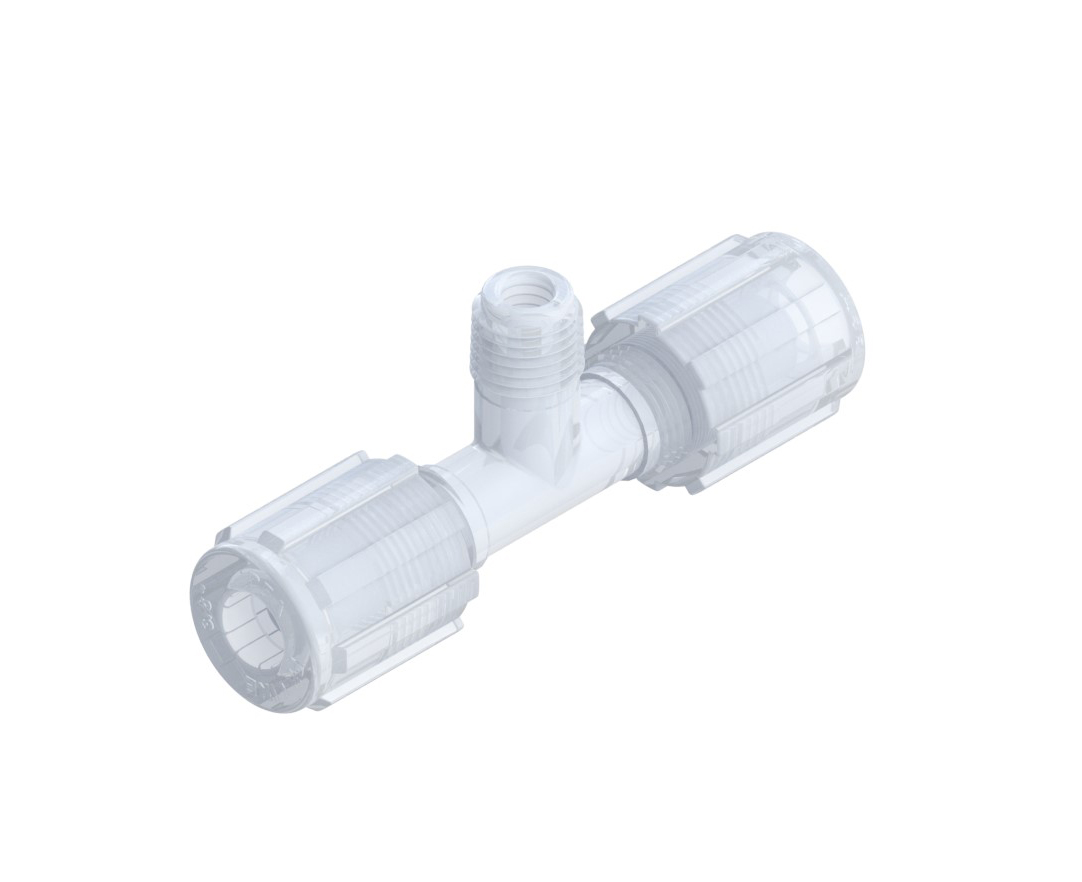 MALE BRANCH TEE, 3/8″F X 1/4″MNPT X 3/8″F W/ PFA NUTS