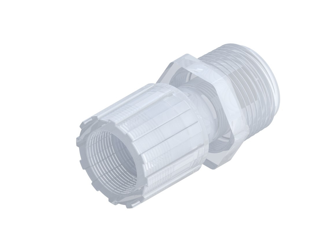 MALE CONNECTOR, 3/4″ TF X 1″ MNPT W/ PFA NUT