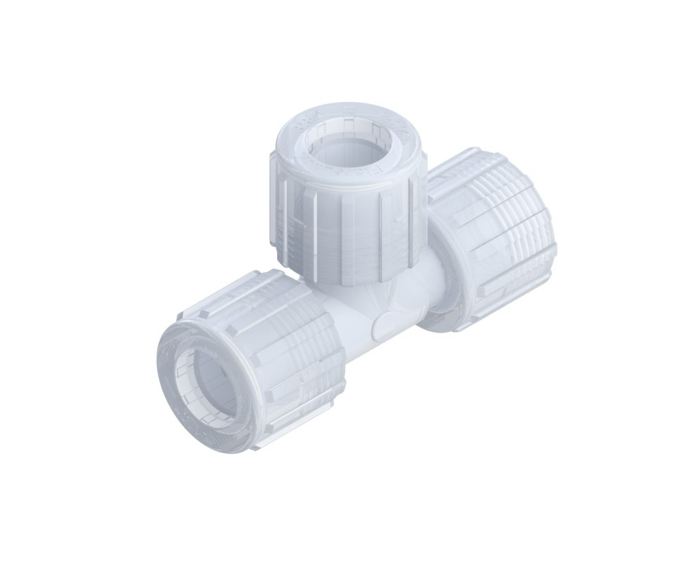 UNION TEE RUN, 1-1/4″ F X 1-1/4″ F X 1-1/4″ TF W/ PFA NUTS